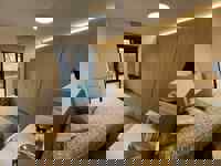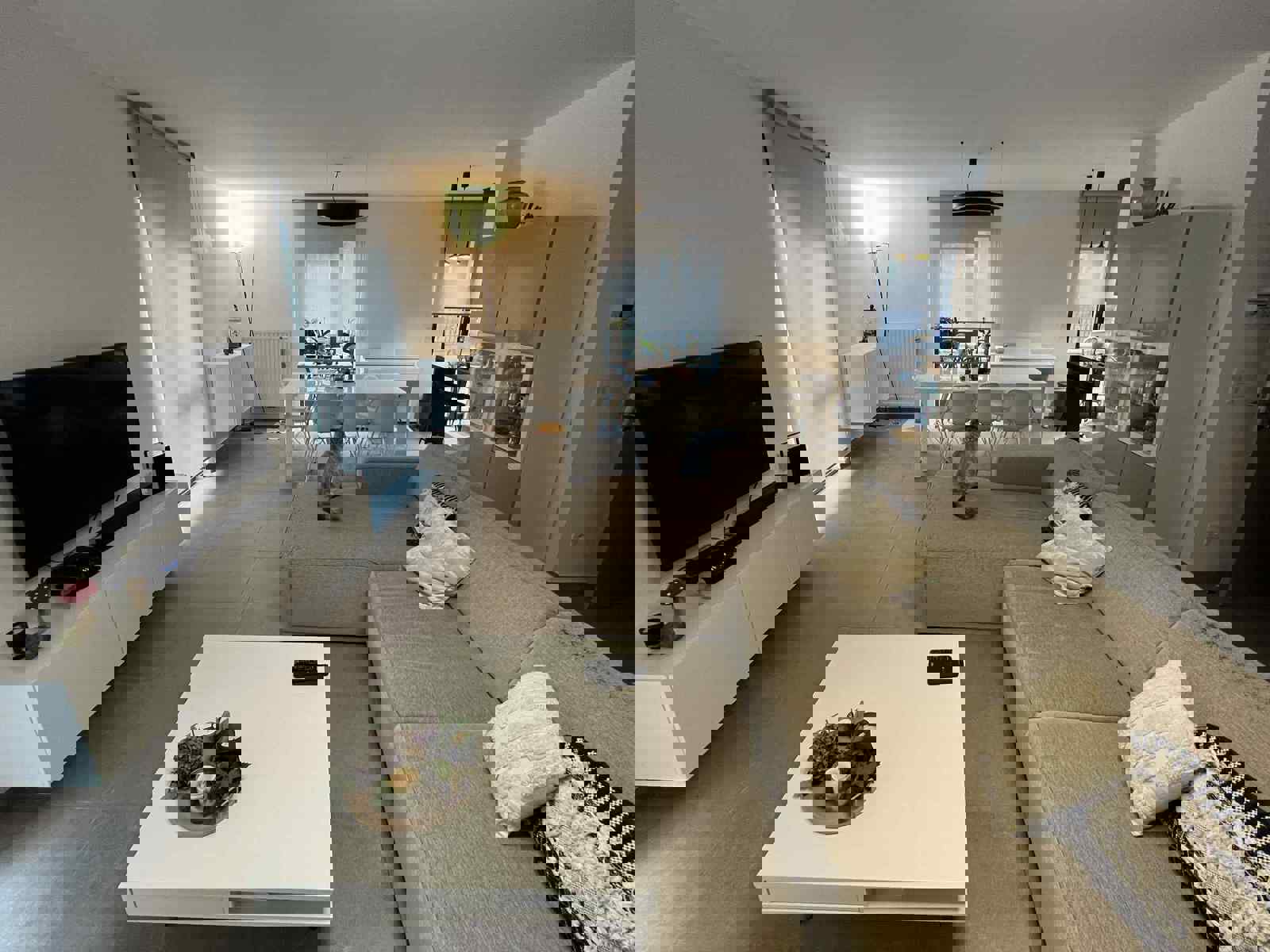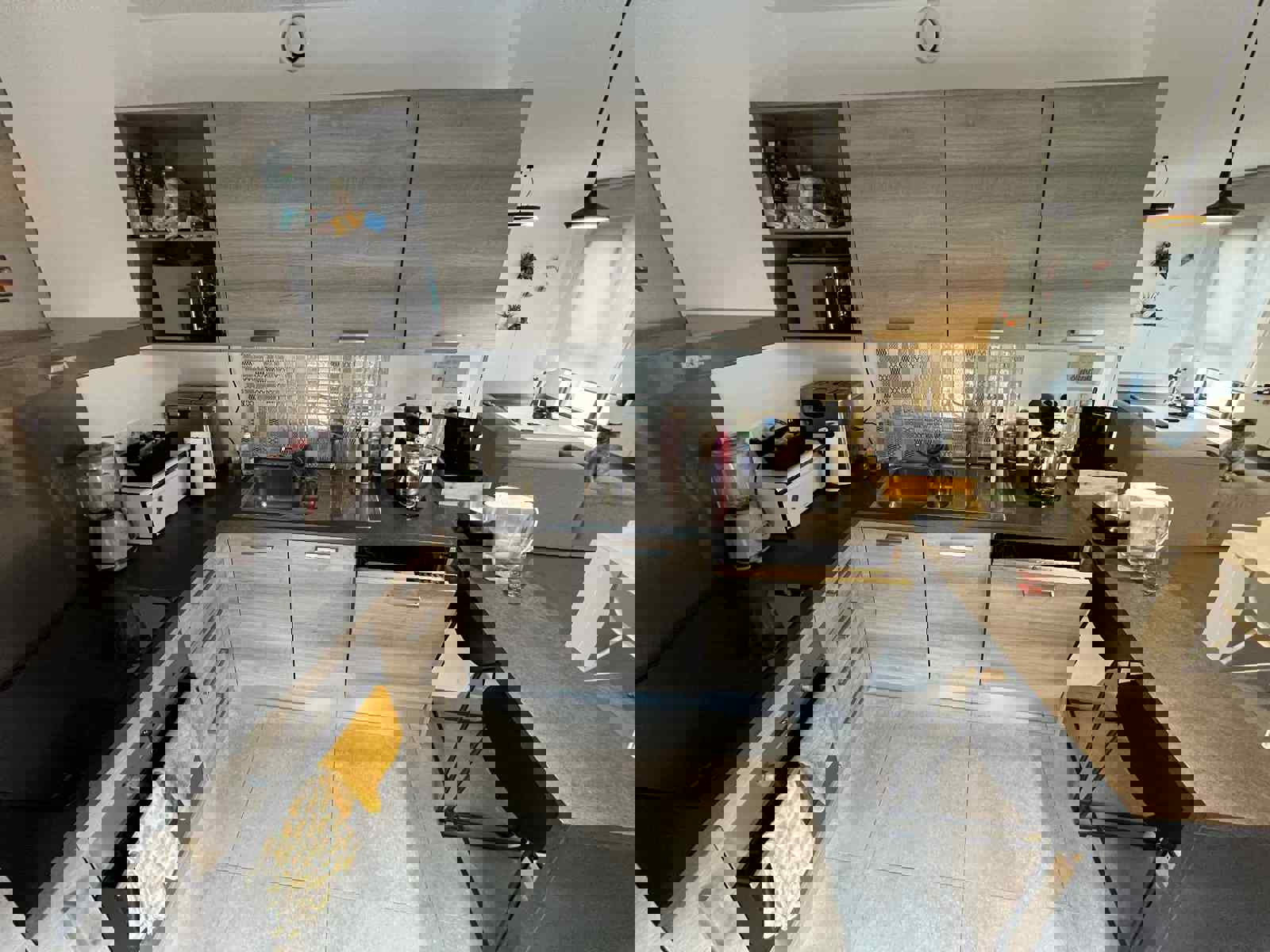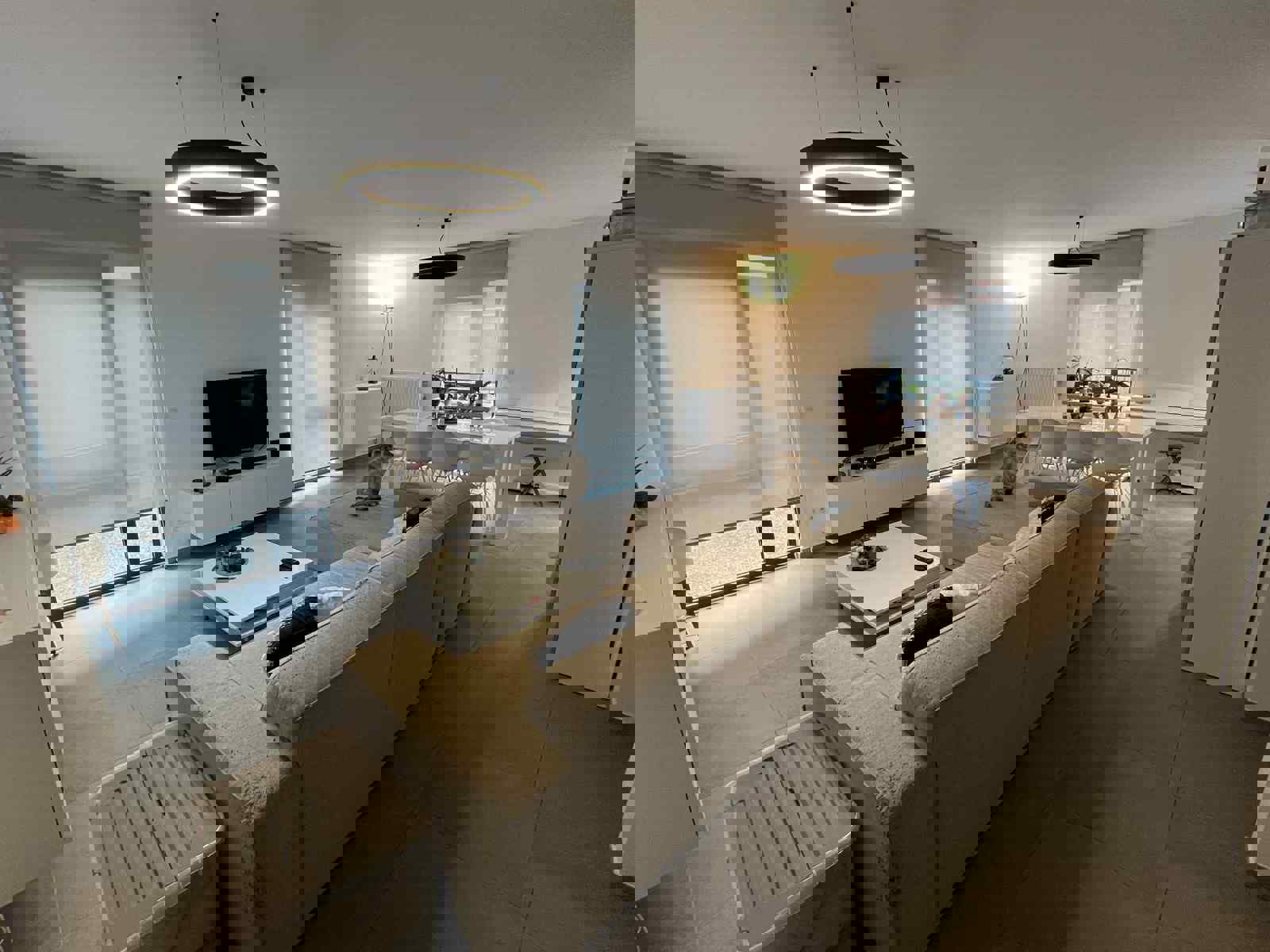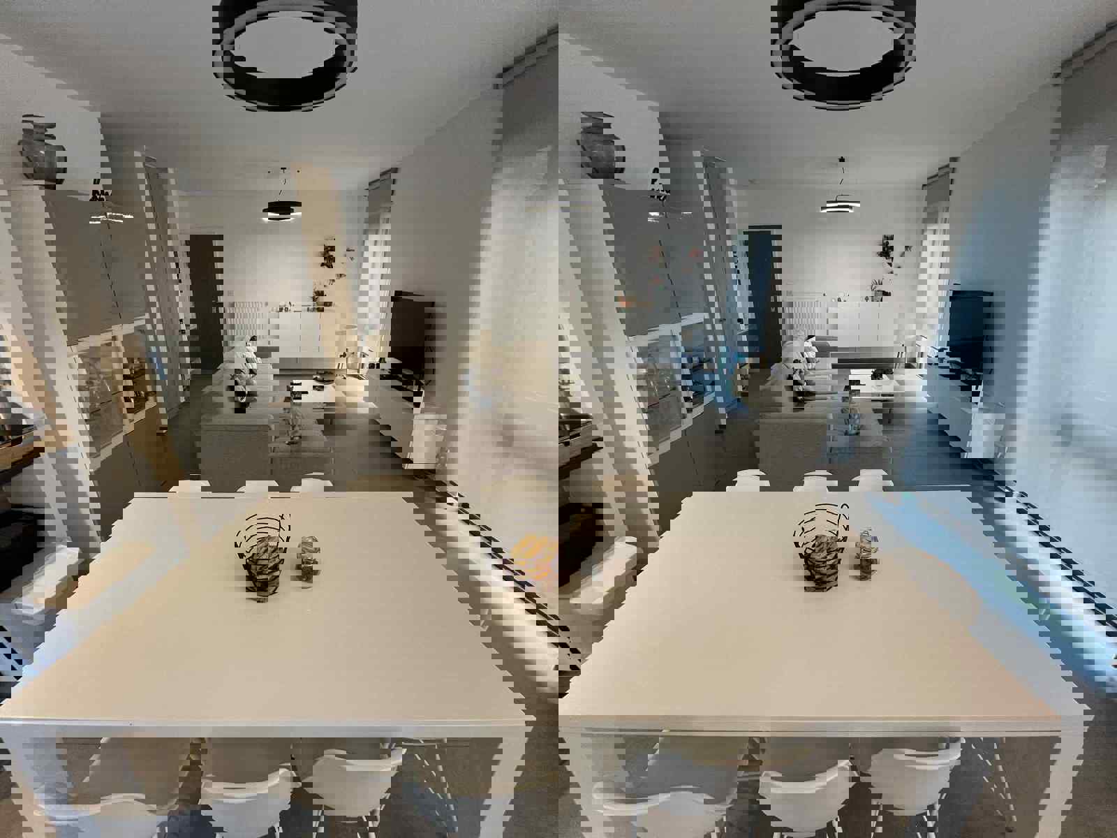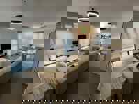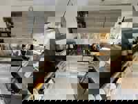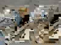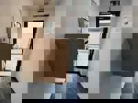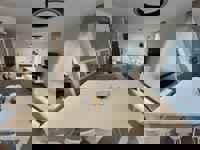 Hall d'entrée menant vers un grand et lumineux séjour ouvert de +/- 42 m2 comprenant le salon, la salle à manger et la cuisine équipée - 2 chambres de +/- 13m2 chacune avec dressing intégré - Salle de douche de +/- 5m2 - WC - Buanderie