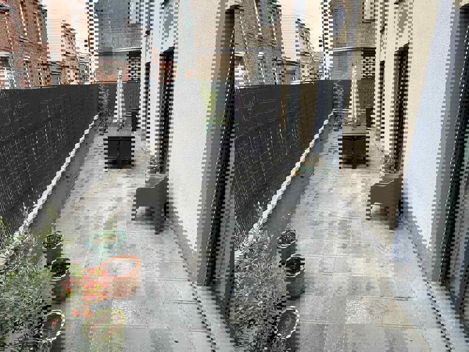 EXTERIEUR : Agréable terrasse de +/- 20m2 - 1 Cavette pratique pour le rangement - 1 place de parking privative dans un parking sécurisé -