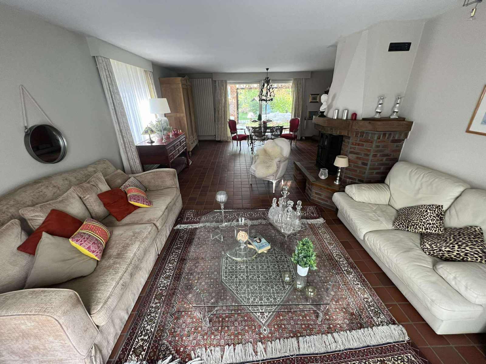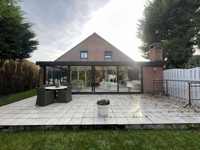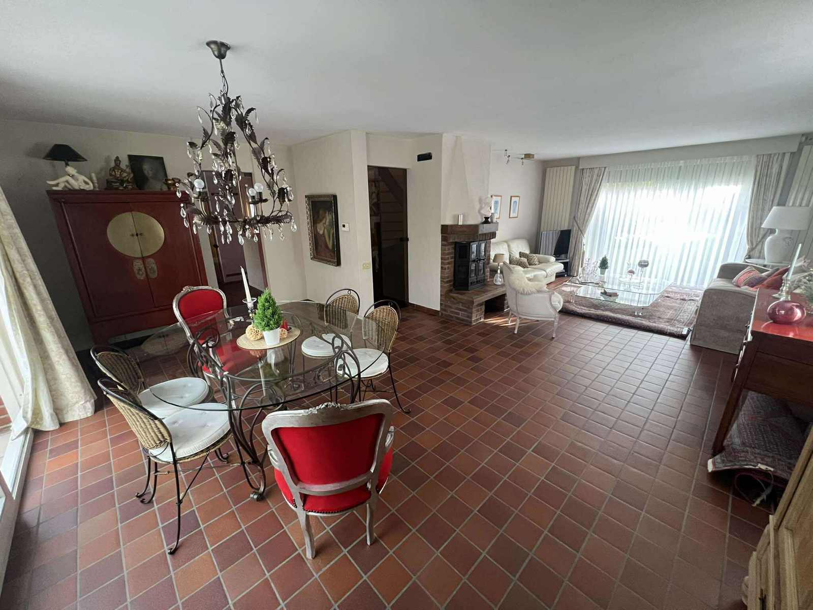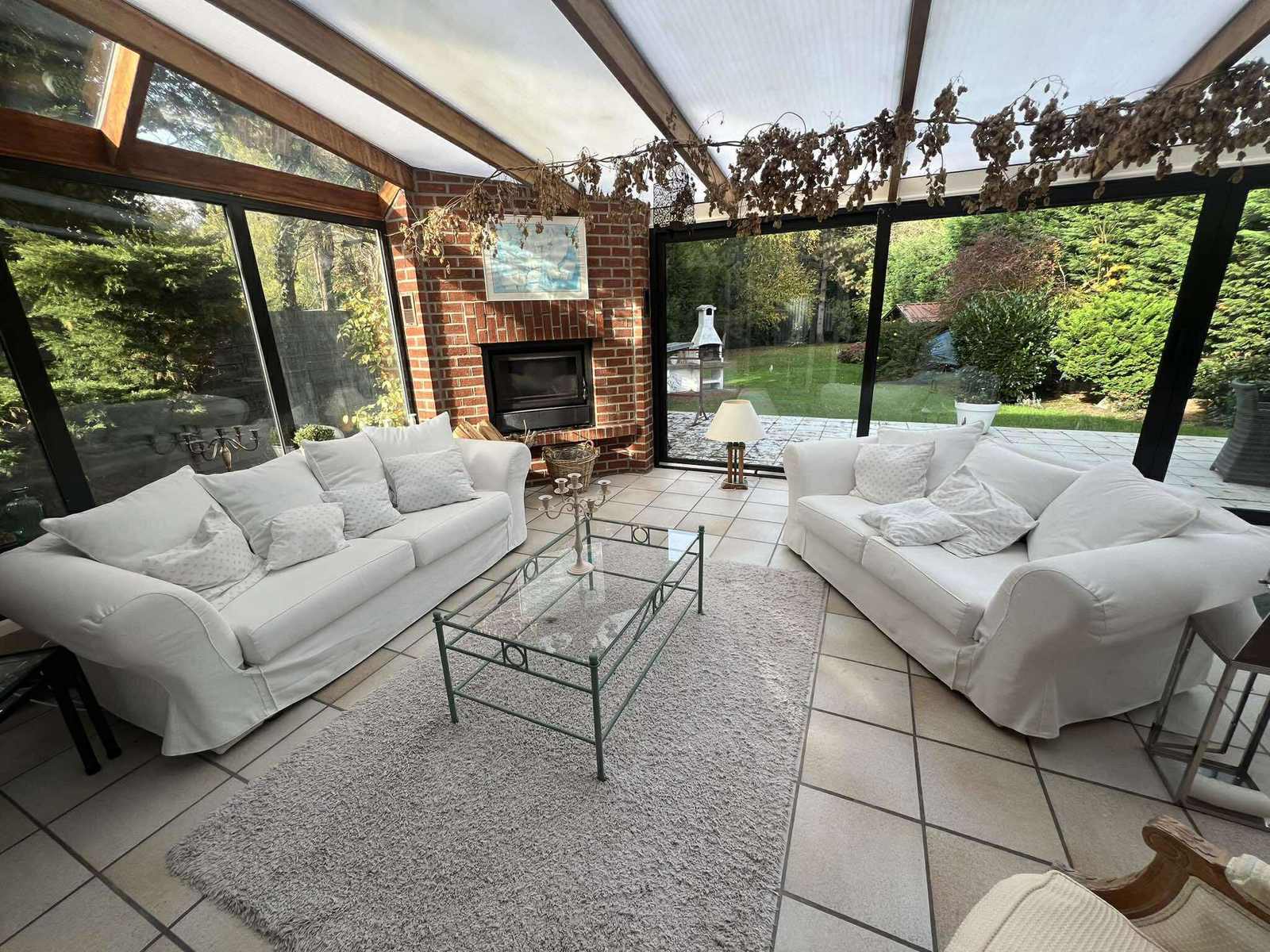 Rdc : Hall d’entrée spacieux de ± 12 m² avec WC séparés et lave-mains - Lumineux séjour de ± 40 m² - Cuisine équipée de ± 15 m² avec coin repas - Buanderie fonctionnelle de ± 5 m² - Superbe véranda de ± 30 m² avec feu à bois, idéale pour profiter du jardin en toute saison