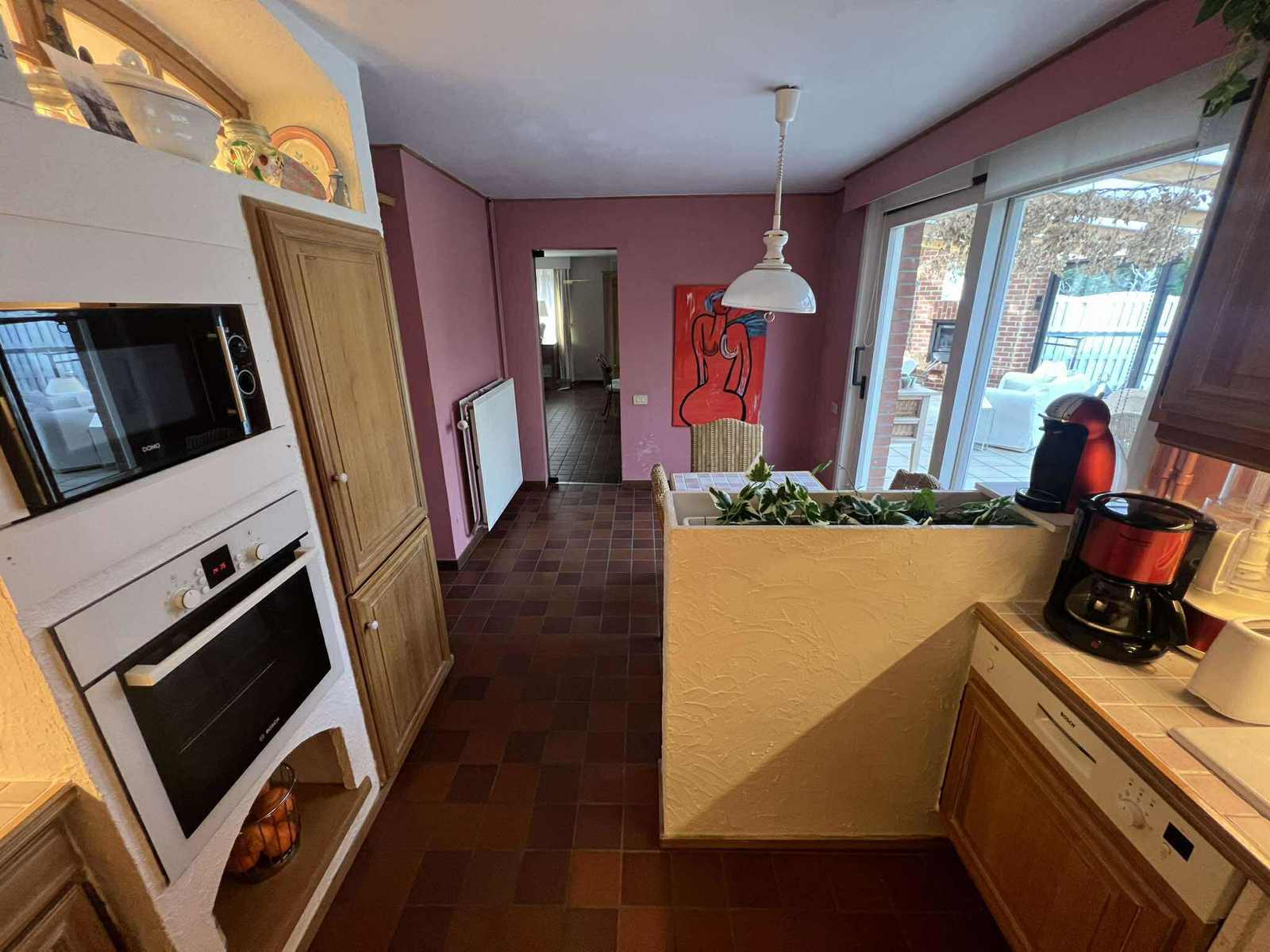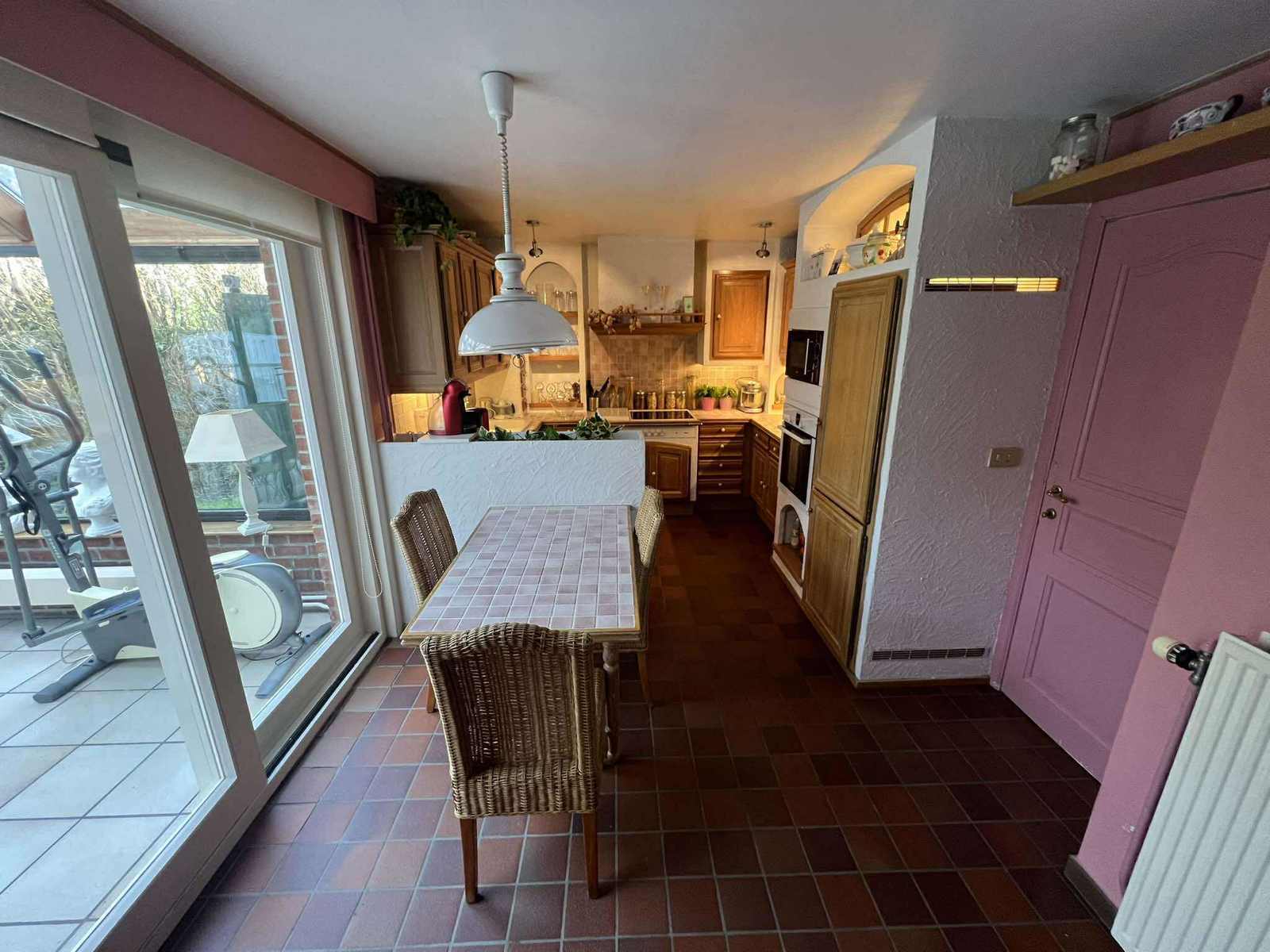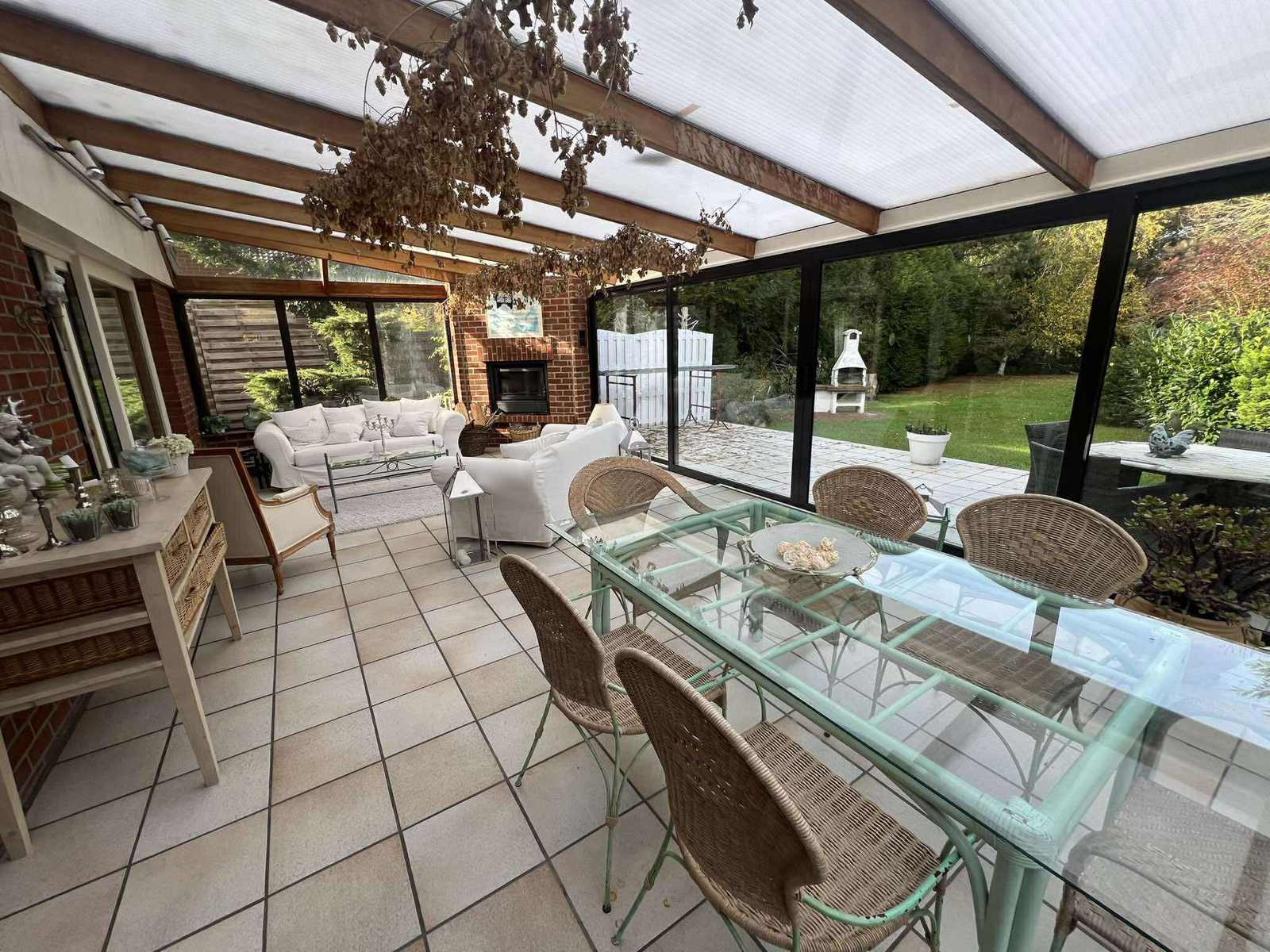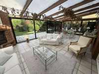 Rdc : Hall d’entrée spacieux de ± 12 m² avec WC séparés et lave-mains - Lumineux séjour de ± 40 m² - Cuisine équipée de ± 15 m² avec coin repas - Buanderie fonctionnelle de ± 5 m² - Superbe véranda de ± 30 m² avec feu à bois, idéale pour profiter du jardin en toute saison
