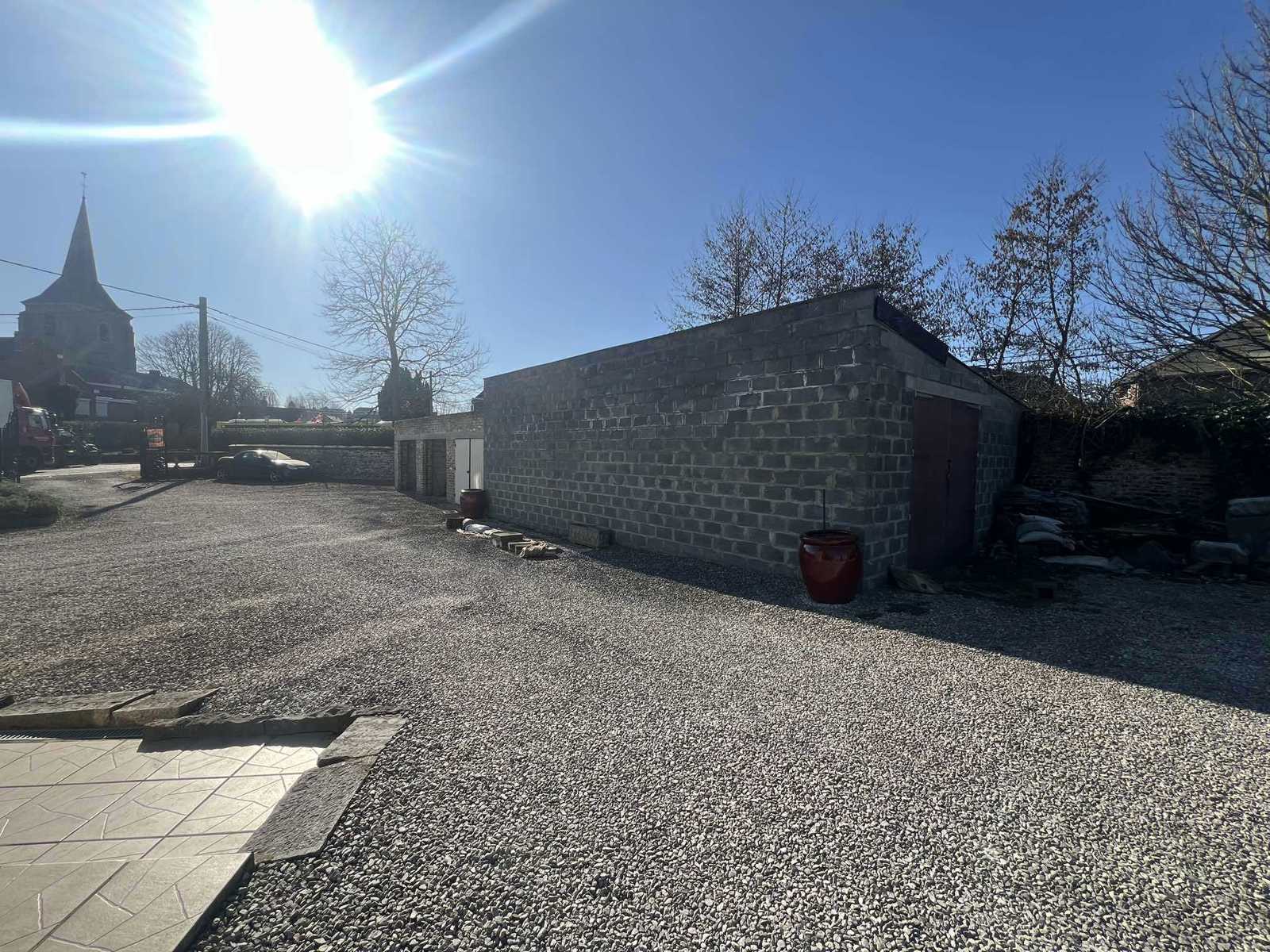 EXTERIEUR : Grand jardin (terrain à bâtir) - Parking pour plusieurs véhicules - Trois garages une voiture - Hangar de +/- 50 m²